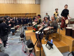 今回はNPO法人「一期JAM」さんによるゲスト演奏もしていただきました。打楽器によるアフリカンミュージックです。理事長の山崎さんは東京高校出身の方です。体験コーナーありで、皆さん楽しんで頂いたようでした。人数が多めにもかかわらずテンポもリズムもずれないすごさ!めったに体験できない音楽の形式でした。軽音楽の練習の大きなヒントとなればと思います。